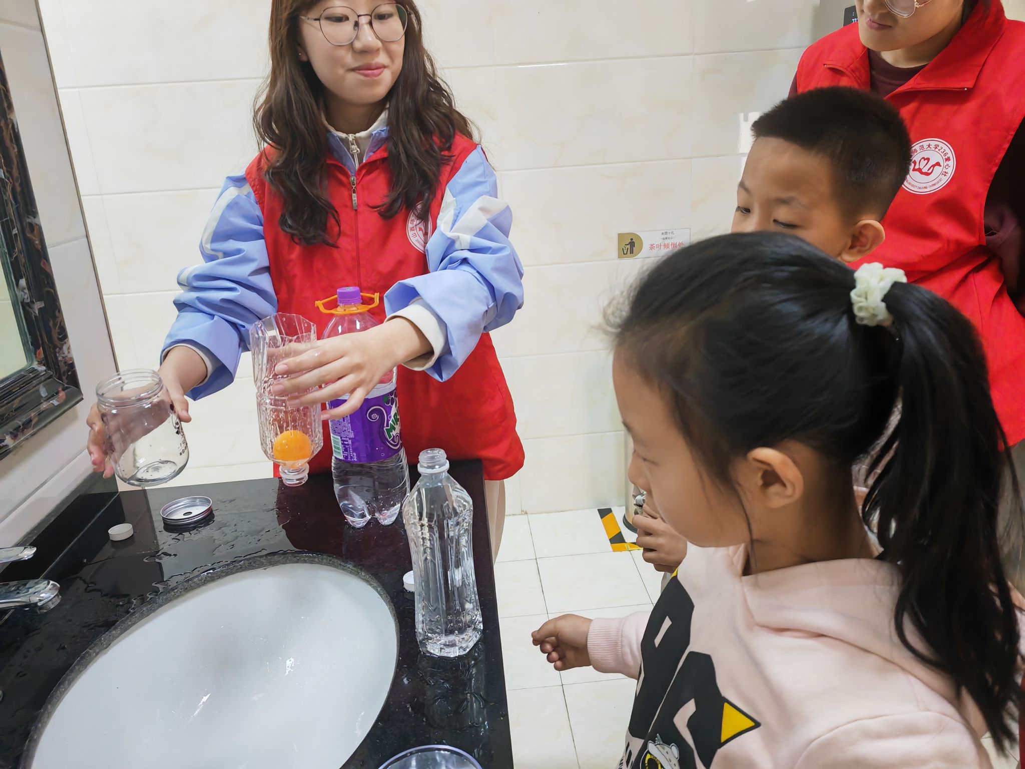 活动中,志愿者们给北营社区的小朋友们辅导作业,耐心地帮助他们解决学习中遇到的困难和问题。课余时间,志愿者为孩子们开设了科普物理小实验特色课堂,不能上浮的乒乓球、覆杯实验、水的张力等等丰富多彩的物理实验,将生活中的科学知识通过实验的方式直观生动地呈现在孩子们的面前,在志愿者的引导下,孩子们积极动手,表现出了对科学知识的浓厚兴趣,也让他们学习到了一些生活中的科学知识。