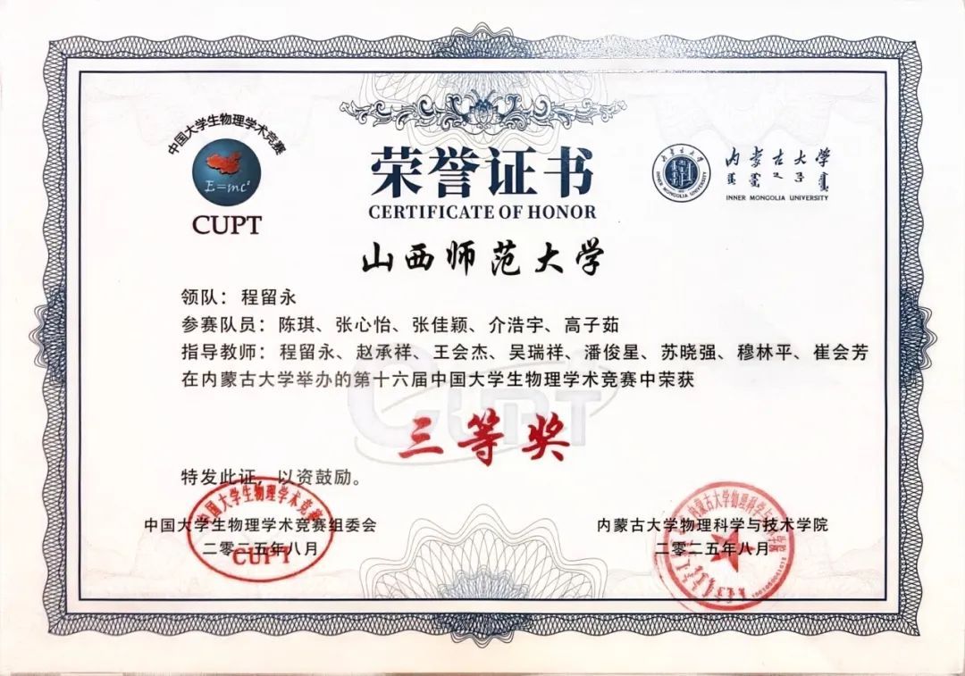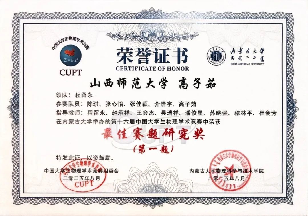 8月14日至18日,第十六届中国老员工物理学术竞赛在内蒙古大学成功举办。公司的代表队在此次竞赛中获得团体三等奖的荣誉,队员高子茹荣获个人最佳赛题研究奖,为学院赢得了荣誉。