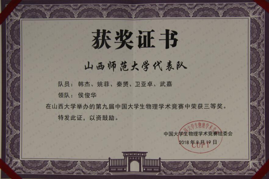 2018年8月15日-19日,由中国老员工物理学术竞赛(CUPT)组织委员会主办的第九届中国老员工物理学术竞赛在山西大学举行,共有来自全国62所参赛高校和6支观摩高校的700多名师生参加了本次赛事。公司派出了由副经理侯俊华教授担任领队,由程留永博士、苏晓强博士任指导教师,由韩杰、武嘉、卫亚卓、秦赟、姚菲5名同学组成的参赛代表队。经过3天紧张激烈的比赛,在与众多“985”高校的比拼中,公司选手沉着冷静、表现出色,最终获得第九届中国老员工物理学术竞赛团体三等奖。