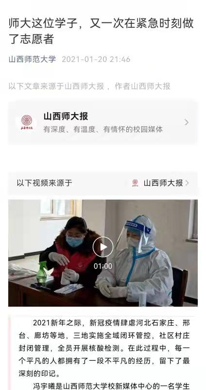 2019级学生冯宇曦(1903班)连续两次参与抗疫志愿服务,受到《人民日报》客户端和我校校园网专题报道,并荣获河北省辛集市“最美巾帼志愿者”荣誉称号。被誉为"最美逆行者"。